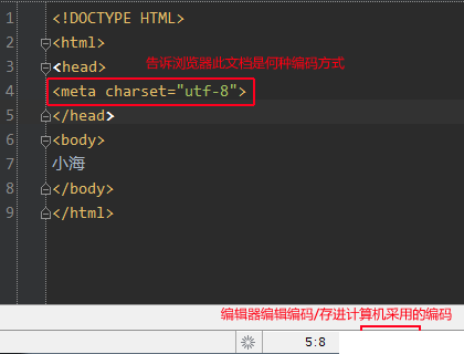 我们在编写此文档时,是以UTF-8编码方式进行coding,当我们按下ctrl+s时,则此文档以utf-8编码方式存储进了计算机(右下角的UTF-8),而head区域中的的作用则是告诉浏览器此文档以utf-8编码方式编码。