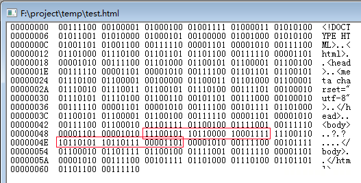 其中红框标注出的即为“小海”两个中文字的二进制流,第一个为”11100101 10110000 10001111″转化为十六进制则为“E5B08F”,第二个为“10110101 10110111 00001101”转化为十六进制为“E6B5B7”,而当我们去查询UTF-8的码表时发现“E5B08F”对应的字符为“小”,“E6B5B7”对应的字符则为“海”,至此当我们用浏览器进行预览页面时,由于浏览器同样以UTF-8方式对此页面进行解码,“小海”两个字则可以被正确的显示出来。