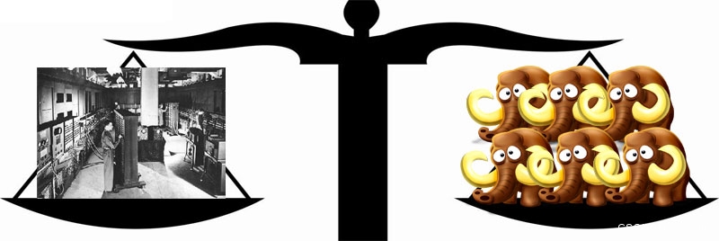 再后来到了1946年,世界第一台计算机诞生。发明计算机的同学们用8个晶体管的“通”或“断”组合出一些状态来表示世间万物,不过当时的计算机有一间半教室那么大,六头大象重,从现在看来这简直就是个怪物,但在当时却是震惊世界与改变世界的一项重要发明: