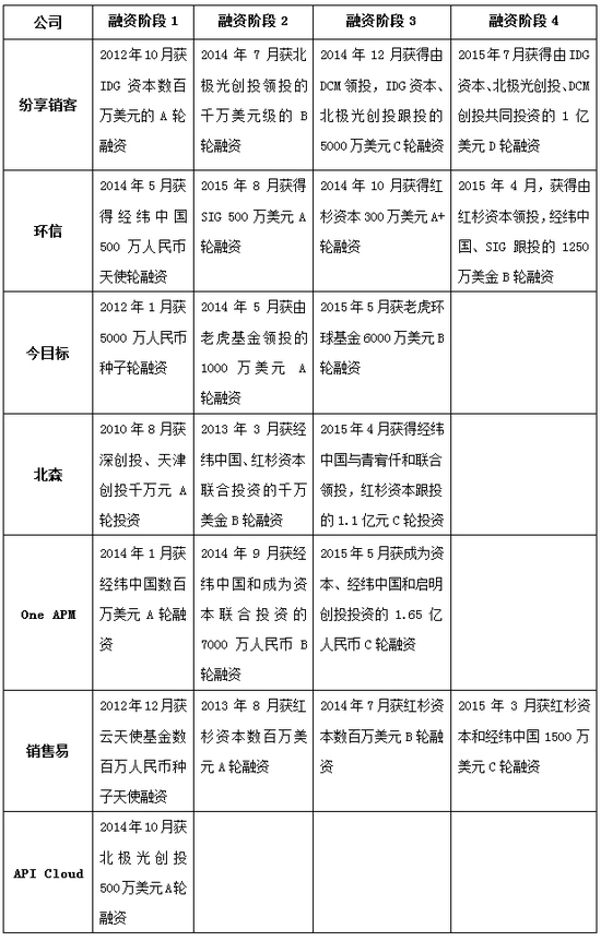 这两年在企业级服务市场中,涌现出了大量SaaS创业型企业。据了解,移动销售服务提供商纷享销客在一年的时间内拿了三轮近2亿美元投资;人力资源及人才管理的服务商北森在今年4月份获融1.1亿元C轮融资;此外,还有专注于企业客服服务的环信、专注企业销售的销售易都纷纷获得融资。记者简单梳理了几家被资本看好的SaaS企业服务企业的融资情况:
